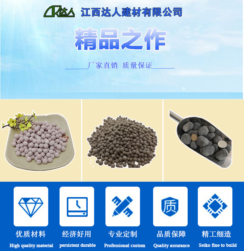 江西達人建材有限公司所生產的陶粒輕質性更佳,具有密度小、強度高、吸水率大、保溫、隔熱、耐火、抗震等特點,用途十分廣泛,在取代普通砂石配制輕集料混凝土,用作水處理濾料、吸附劑、透水路面材料甚至于農業、園林中無土培養基、橋面板。空心砌塊等建材原料都有著十分耀眼的表現;